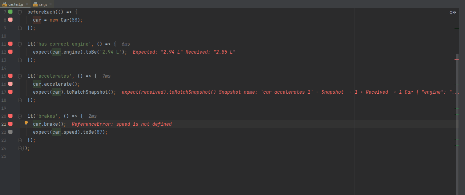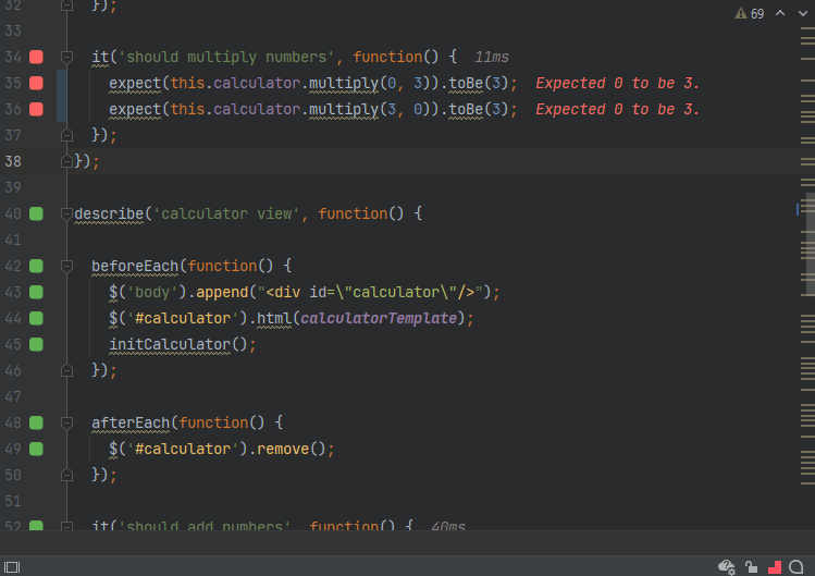 faster testassertion toexpect(1).toBe(1);to make the test pass. - As you may see from how fast the editor gutter indicator turns from red to green, the