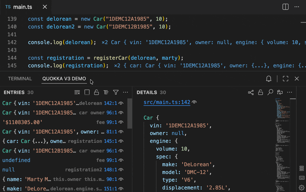 - Log map: a tree view of active logpoints and their output for quick navigation and real-time observation of how values change at specific code points.