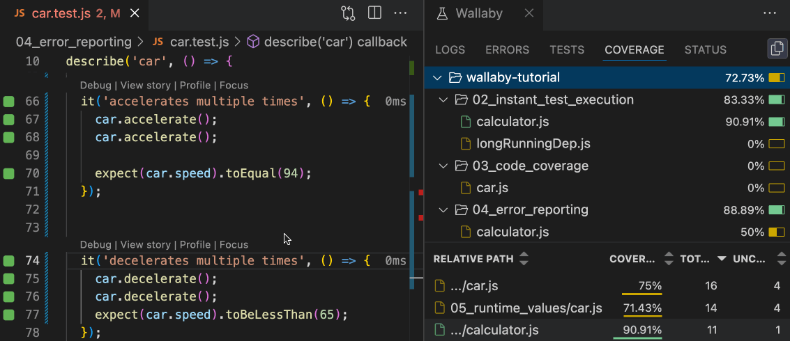 - Smart Start: Coverage shows only source files executed by the watched test files.