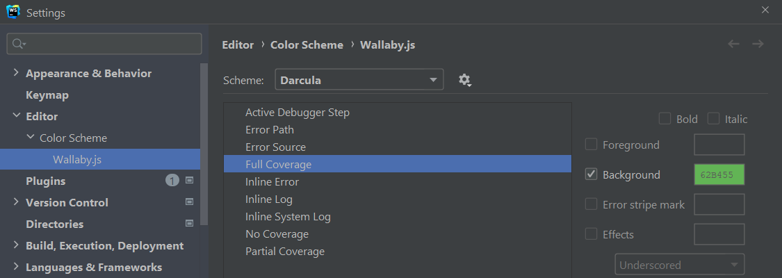 - You can customize Wallaby indicator colors in JetBrains user settings.