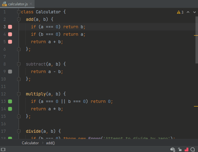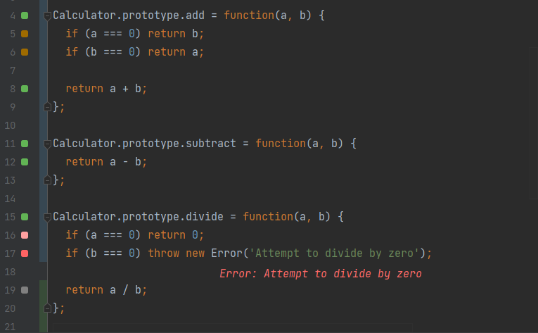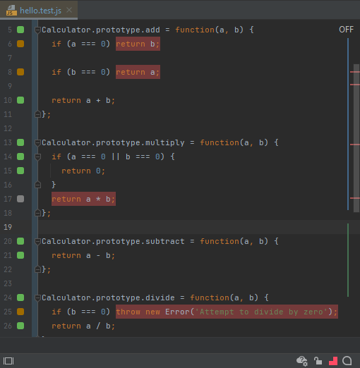 The meaning and the functions of the gutter indicators are fully explained in the Inline Code Coverage tutorial module. In the context of the current tutorial module, a green indicator means that the test is passing, while a red indicator means that there is an error.