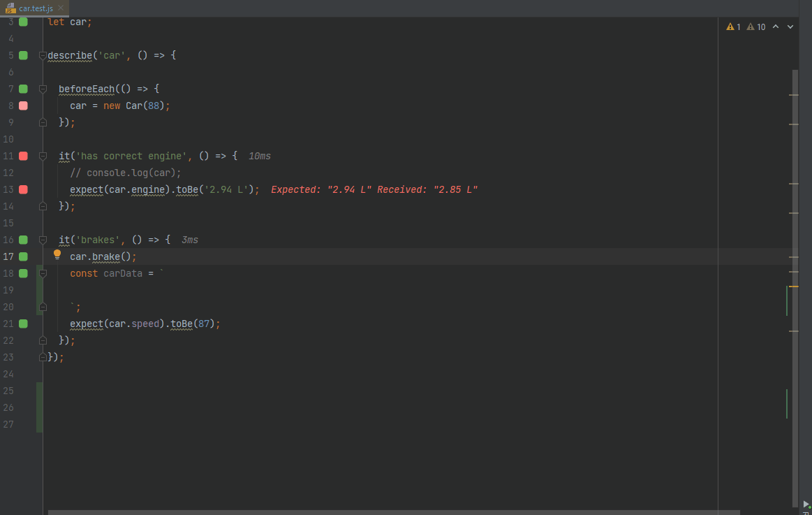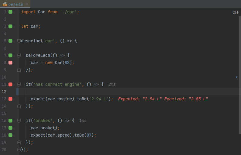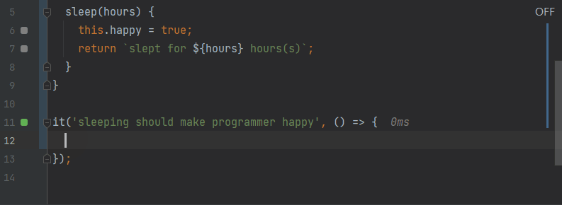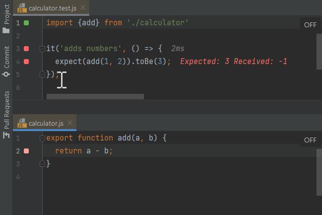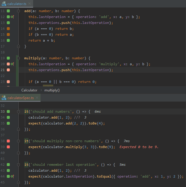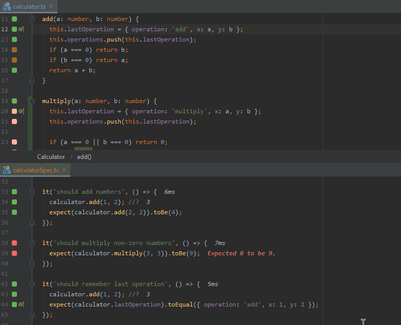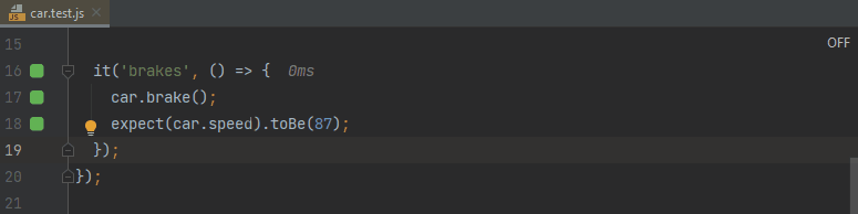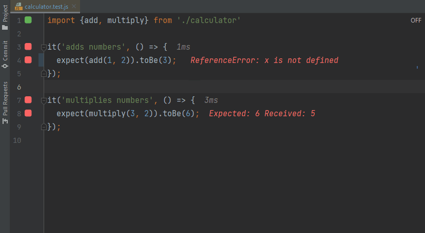 faster testassertion toexpect(1).toBe(1);to make the test pass. - As you may see from how fast the editor gutter indicator turns from red to green, the