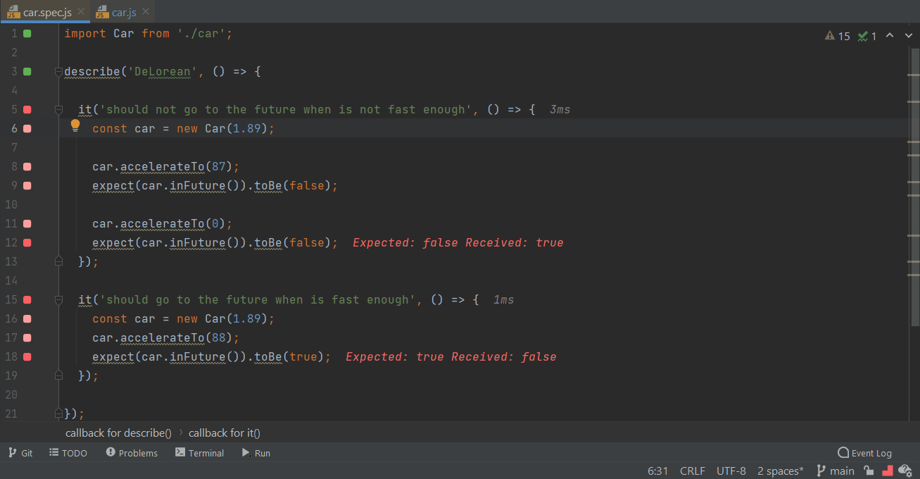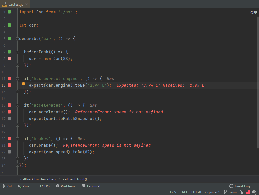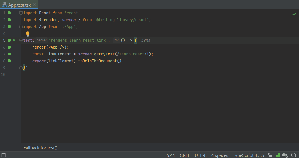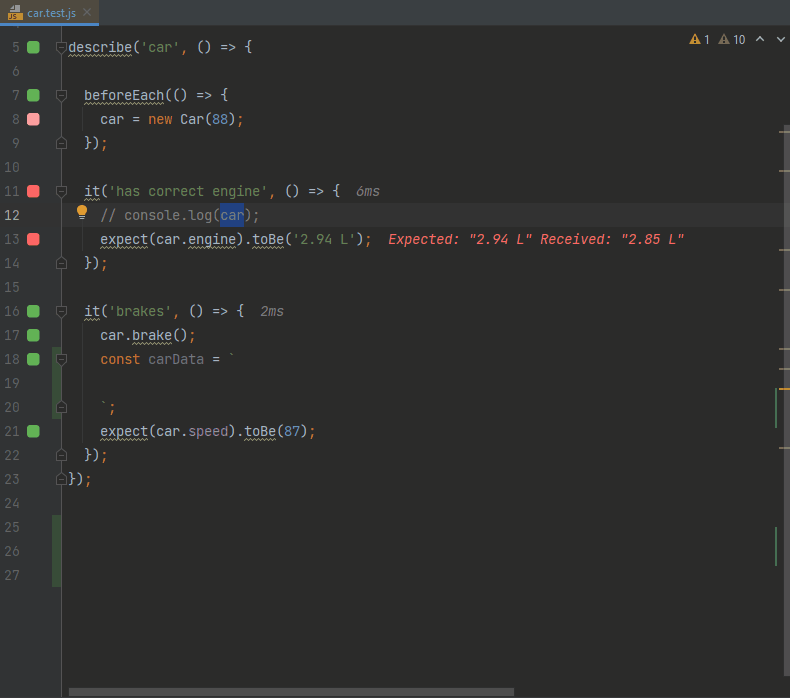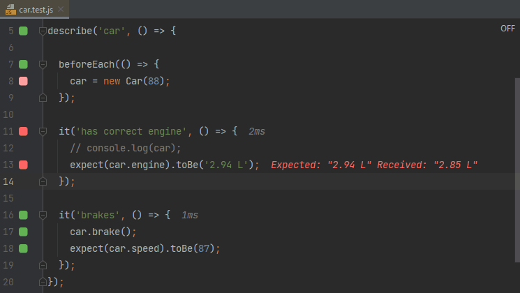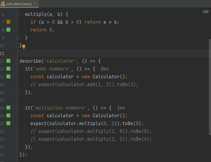 faster testassertion toexpect(1).toBe(1);to make the test pass. - As you may see from how fast the editor gutter indicator turns from red to green, the