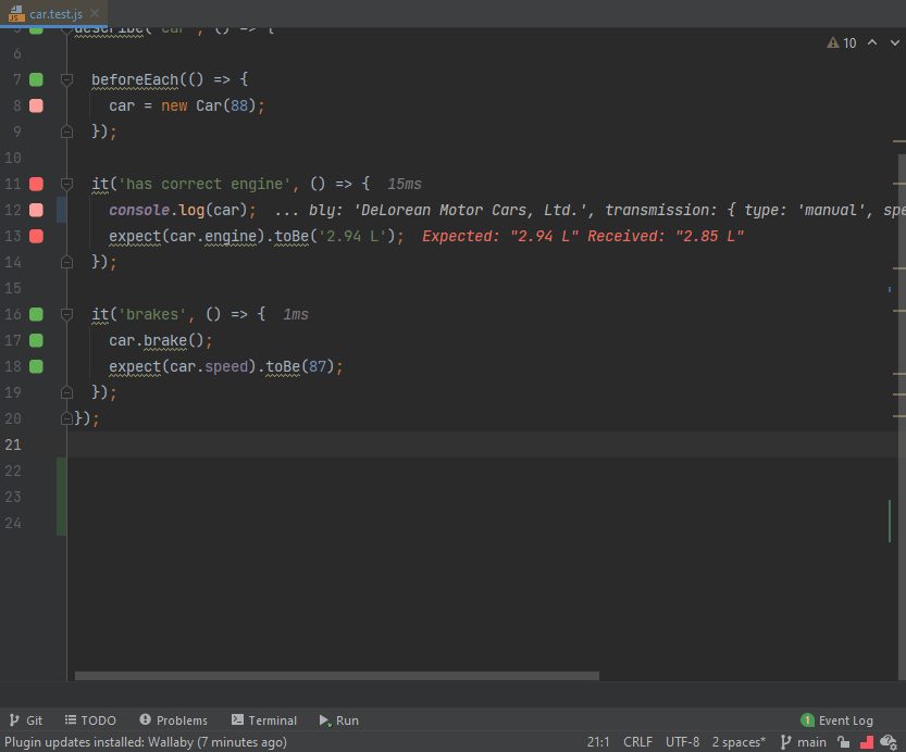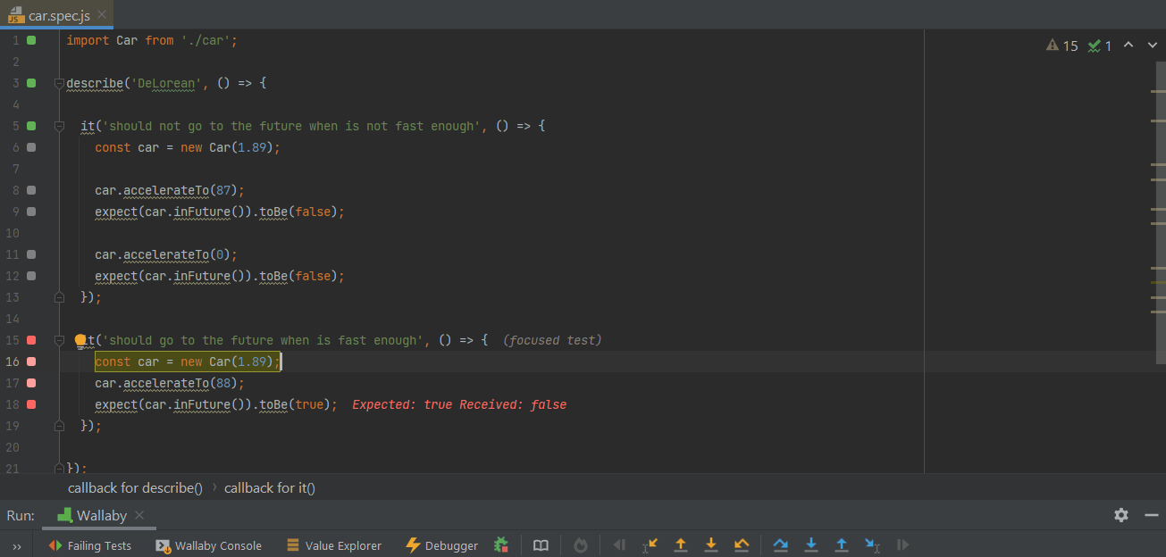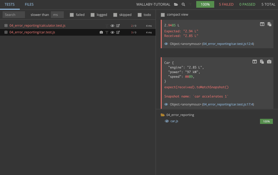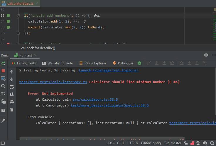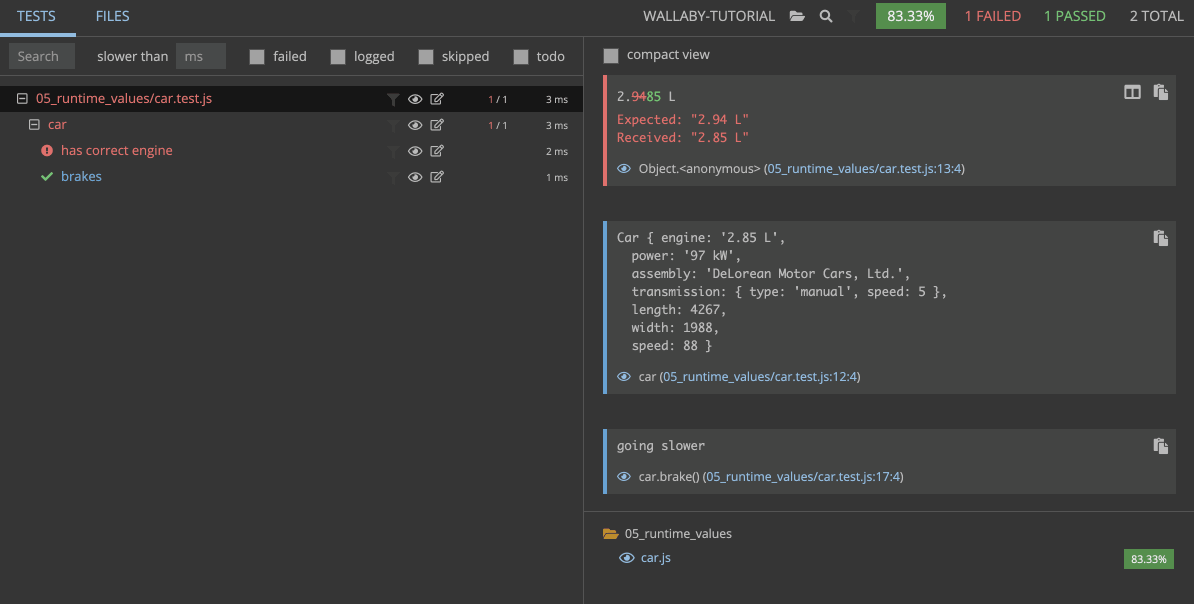 The execution speed is also visible via Wallaby’s status bar indicator which is located at the bottom right corner of the editor window. When you are making the fast test fail/pass, the indicator changes almost instantly. However, if you try changing the assertion of the slower test, you will notice the status bar indicator displays a progress bar while the test is running.