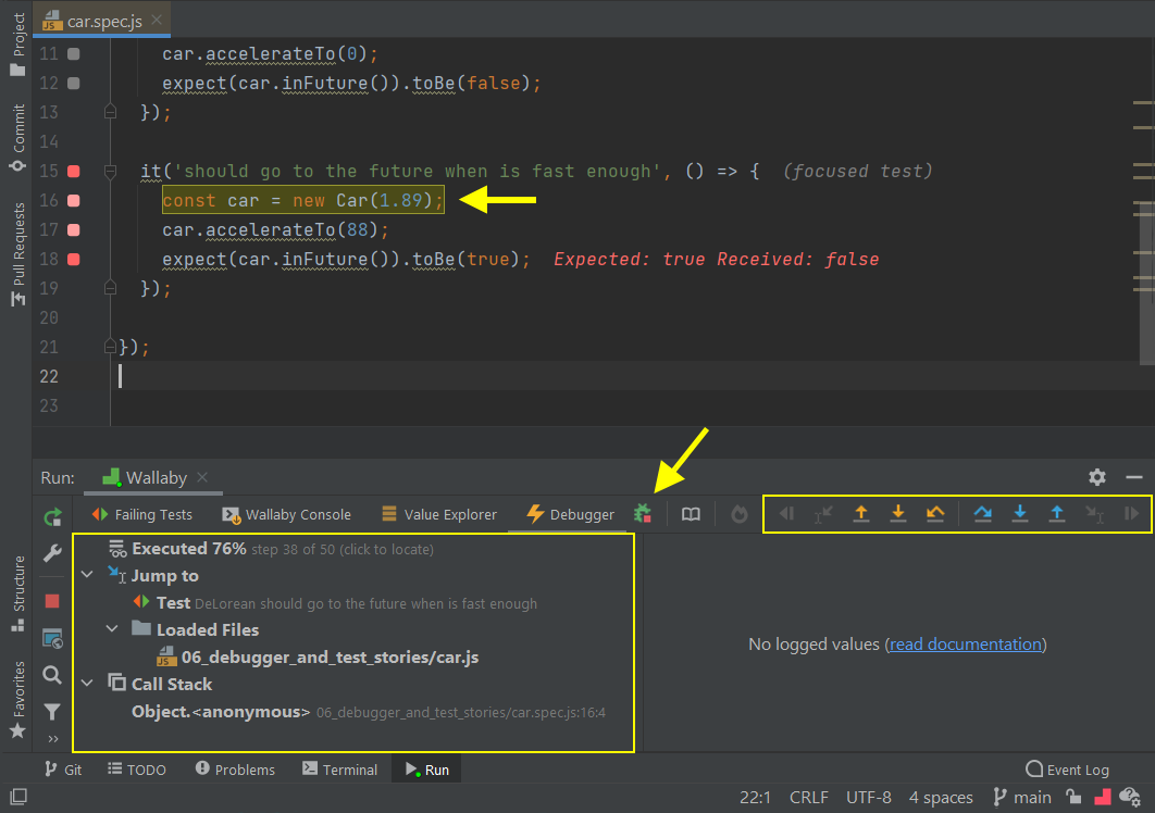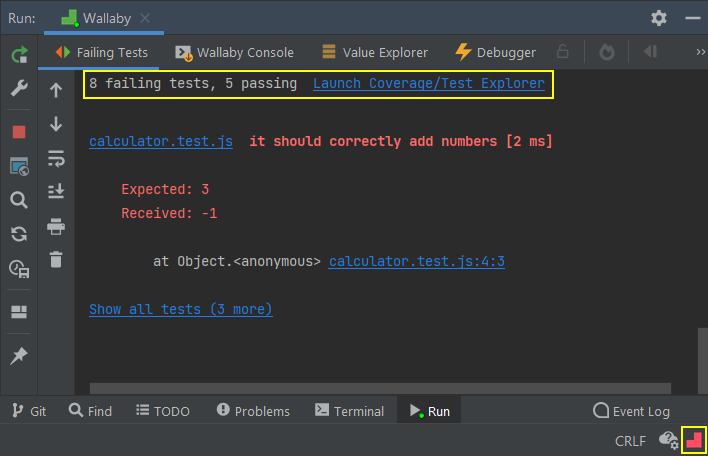 - Check Wallaby's Failing Tests and Console output channels in JetBrains whichdisplay Wallaby runtime errors (including configuration errors).