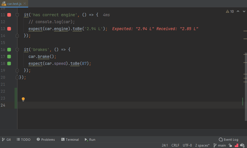 hello.test.js file and have a bit of play. For example, try